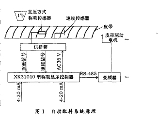 自動配料系統(tǒng)由數(shù)臺配料皮帶秤及其稱重顯示控制器、傳感器、供橋板 和供 電系統(tǒng)組成系統(tǒng)原理如圖1所示,